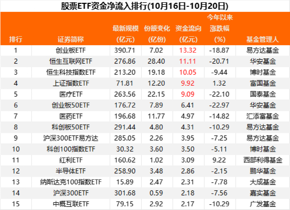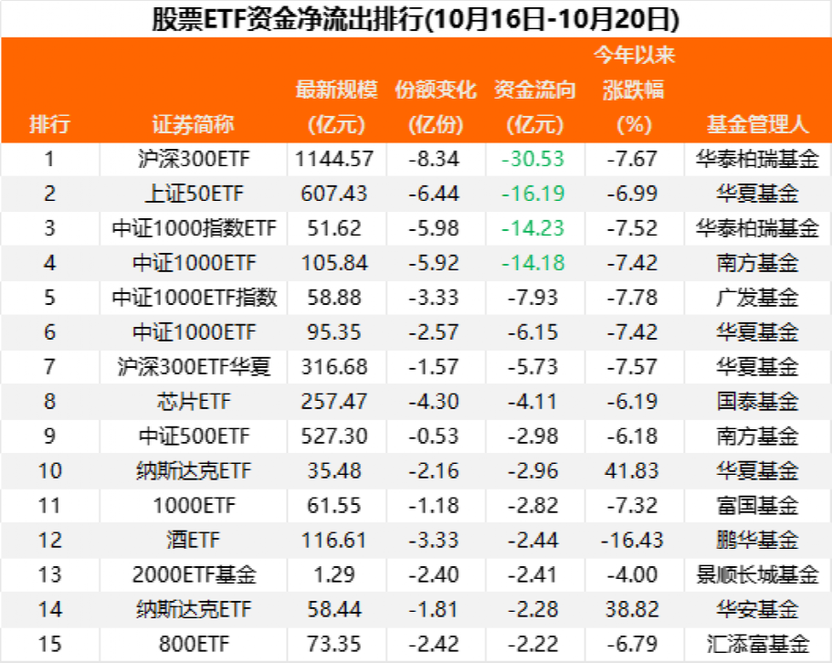 10月16日到20日这一周,受到部分权重股下跌拖累,沪深A股接连失守重要关口。大盘震荡走低中约有12.6亿资金净流出股票ETF,资金落袋为安情绪浓厚。