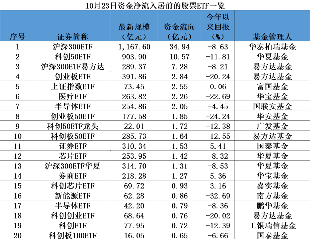 从资金净流入排行看,宽基指数方面,10月23日,沪深300ETF、科创50ETF、创业板ETF上证指数ETF等多只宽基指数产品资金净流入居前。其中,华泰柏瑞沪深300ETF当日增加9.87亿份,至329.77亿份,资金净流入达34.94亿元。紧随其后的是,华夏科创50ETF当日增加11.88亿份,至1024.14亿份,资金净流入达10.57亿元。易方达沪深300ETF当日增加4.30亿份,至171.08亿份,资金净流入达7.28亿元。此外,易方达创业板ETF、富国上证指数ETF单日“吸金”均超2亿元。