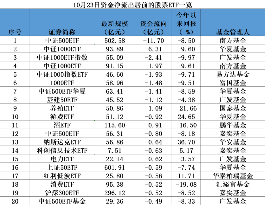 从资金净流出排行看,多只中证500ETF、中证1000ETF成为资金流出主力。比如南方中证500ETF单日资金净流出达11.71亿元,华夏、广发、南方、易方达、富国基金旗下中证1000ETF当日资金净流出居前,其中单日“失血”最多超6亿元,其余大部分资金净流出在1-2亿元区间不等。