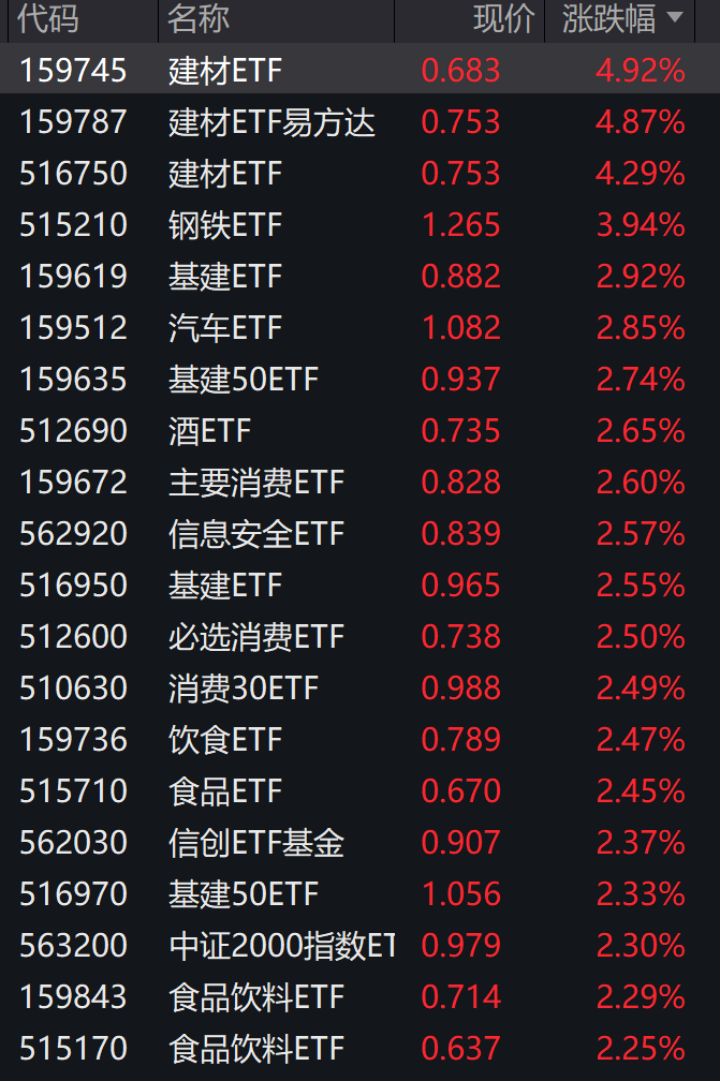 从今日股票ETF二级市场表现来看,健材、基建、钢铁等行业主题ETF涨幅居前。