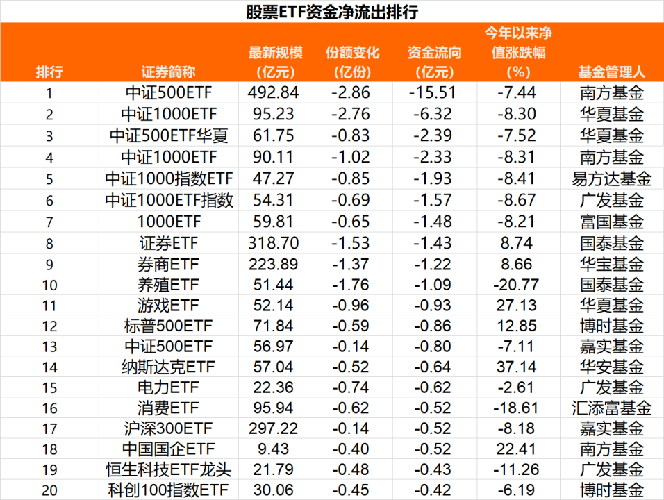 从资金净流出情况来看,中证500ETF、中证1000ETF等宽基ETF“失血”居前。