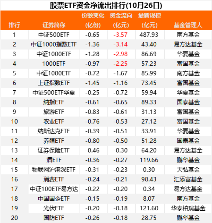 其中中证500ETF单日净流出3.57亿元,居于全市场股票ETF首位。10月20日以来,中证500ETF基金份额连续五个交易日减少,期间份额从95.57亿份下滑至88.79亿份,与月初相比更是缩水10亿份以上,最新规模不足500亿元。昨日同样净流出的中证500ETF华夏份额自10月19日以来连续下滑,最新规模已不足60亿元。