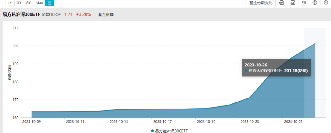 具体到宽基品类来看,跟踪沪深300指数的基金再获大幅加仓。其中沪深300ETF易方达当日份额增加7.26亿份,净流入资金12.4亿元,位居全市场股票ETF首位。自10月10日即10月第二个交易日以来,沪深300ETF易方达份额连续攀升,本周更是以加速度增长,最新份额突破200亿份,创下历史新高。