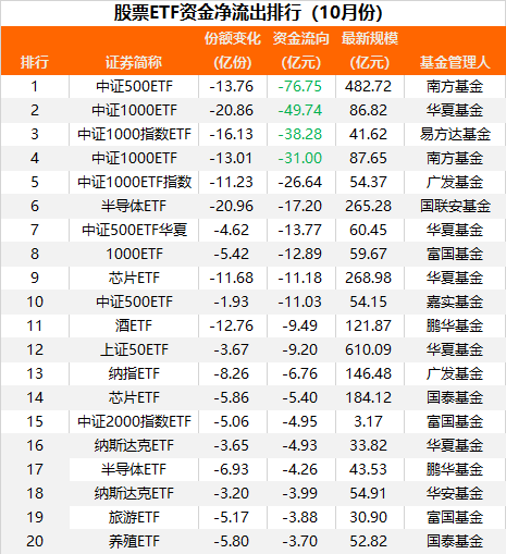 另一方面,资金净流出榜单显示,中小盘风格尤其小盘股风格ETF指数产品“失血”居前。具体来看,中证500ETF是10月份资金净流出最多的股票型ETF,以76.75亿元排在第一。