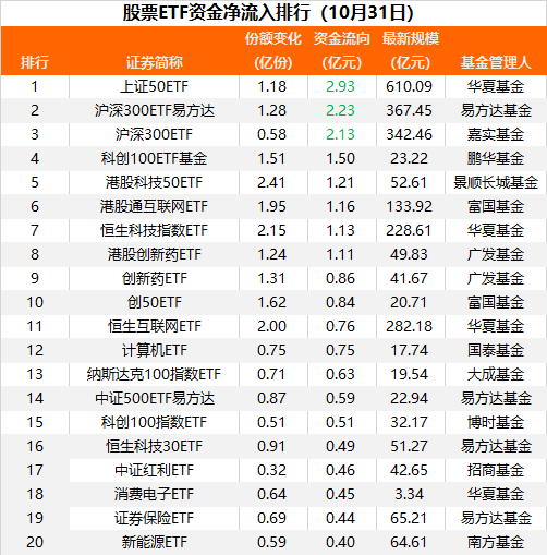 10月31日A股弱势整理,三大指数小幅下跌,沪指止步5连涨。从股票型ETF市场资金流向情况来看,近50亿资金净流出。其中创业板ETF、芯片ETF、创新药ETF资金净流出居前,上证50ETF、沪深300ETF则逆势吸金。