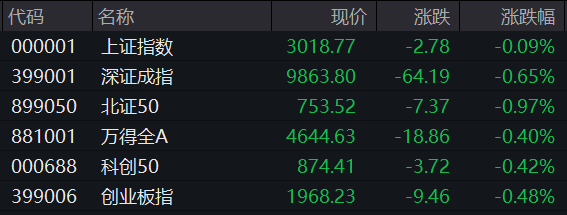 截至收盘,沪指跌0.09%,深成指跌0.65%,创业板指跌0.48%。两市成交超9000亿元。Wind数据显示,总体上个股涨少跌多,两市超3000只个股下跌。
