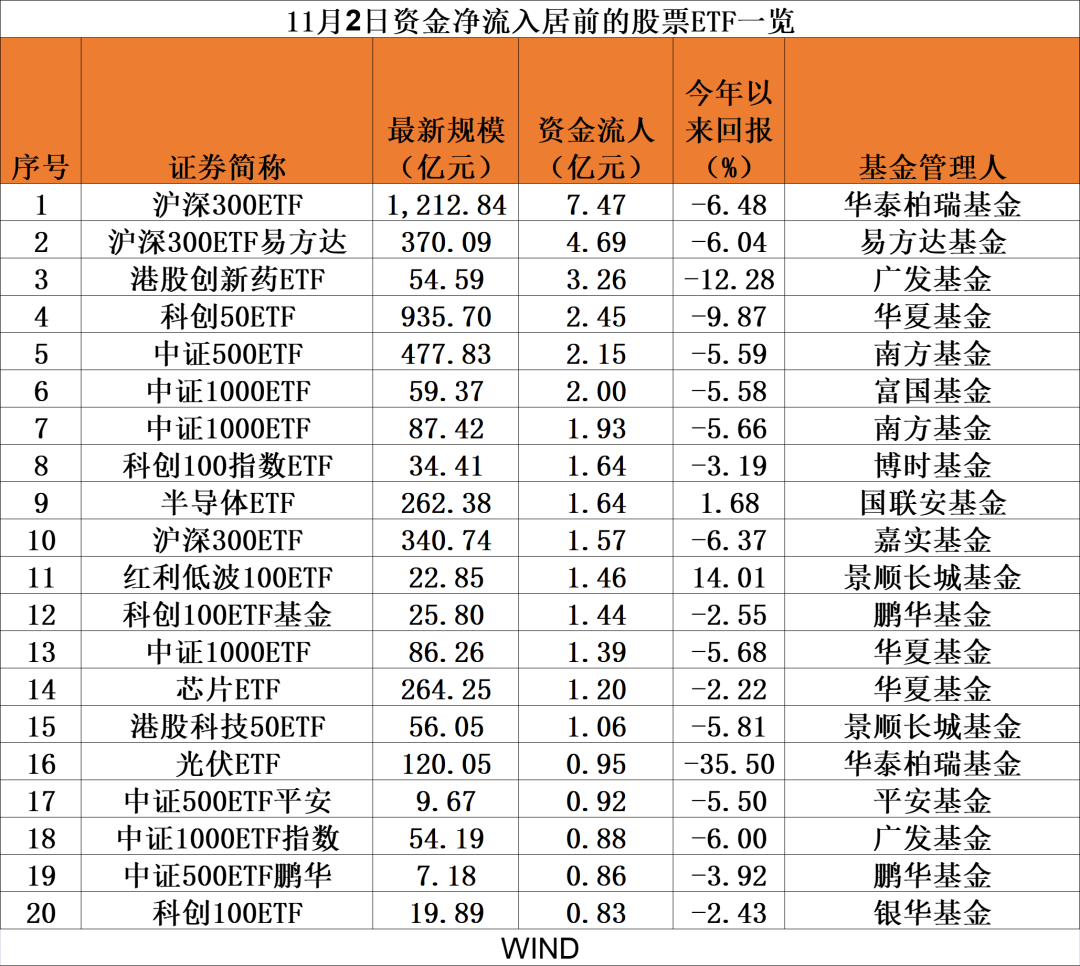 WIND数据显示,截至11月2日,全市场799只股票ETF(统计股票ETF和跨境ETF)管理规模超1.63万亿元。昨日,A股三大指数集体下跌,截至收盘,沪指跌0.45%,深成指跌0.94%,创业板指跌0.99%。行业板块涨少跌多,游戏与文化传媒板块逆市走强,汽车、汽车服务板块涨幅居前,国防军工、电子化学品、半导体、光伏设备、电力设备等走弱。在这样的行情中,沪深两市股票型ETF合计资金仍净流入43.79亿元。