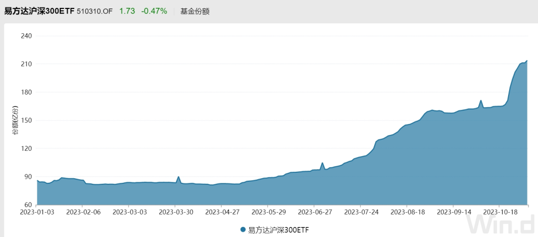 记者注意到,在A股震荡之际,宽基ETF已经成为资金重要的抄底工具。自10月23日中央汇金宣布当日买入ETF,并将在未来继续增持以来,多只股票ETF份额出现大幅增长。以易方达沪深300ETF为例,截至11月2日,10月23日以来该ETF份额增长46.98亿份,按照区间成交均价计算,该ETF共获得85.03亿元资金净流入。