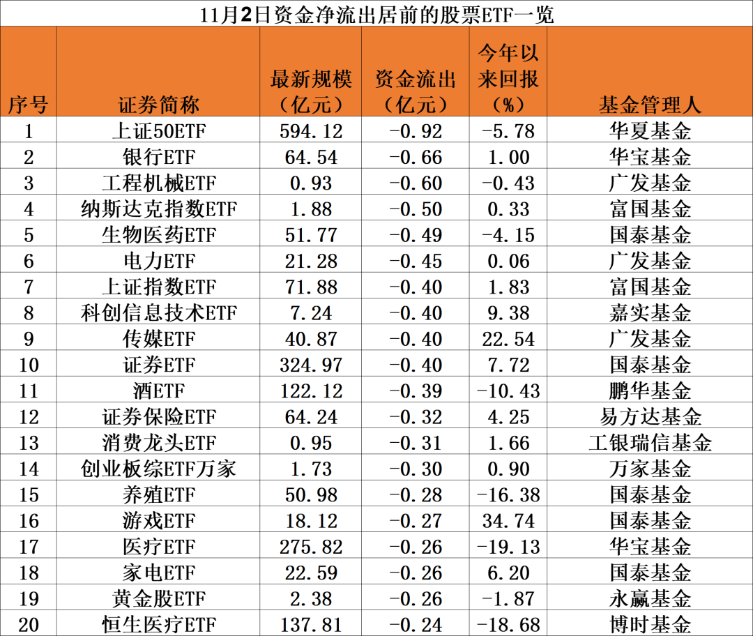 从资金净流出排行看,11月2日,资金净流出靠前的20只股票ETF中,热门细分赛道相关ETF产品占比八成,比如银行、工程机械、生物医药、电力、传媒、证券、酒等相关指数产品当日资金净流出居前。