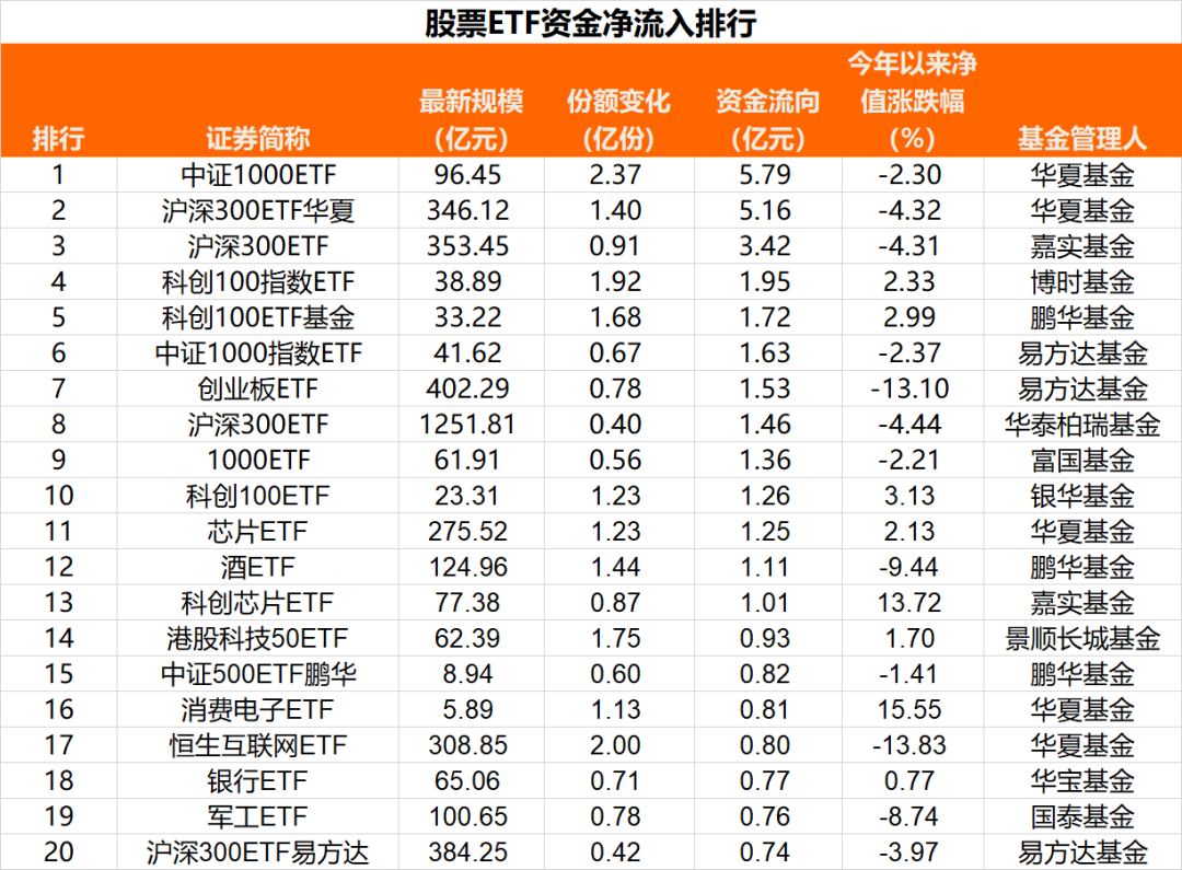 具体来看,华夏中证1000ETF当日净申购2.37亿份,资金净流入5.79亿元,华夏沪深300ETF净申购1.40亿份,资金净流入5.16亿元,嘉实沪深300ETF净申购0.91亿份,资金净流入3.42亿元。此外,博时科创100指数ETF、鹏华科创100ETF基金、易方达中证1000ETF、易方达创业板ETF、华泰柏瑞沪深300ETF、富国中证1000ETF、银华科创100ETF资金净流入均超1亿元。