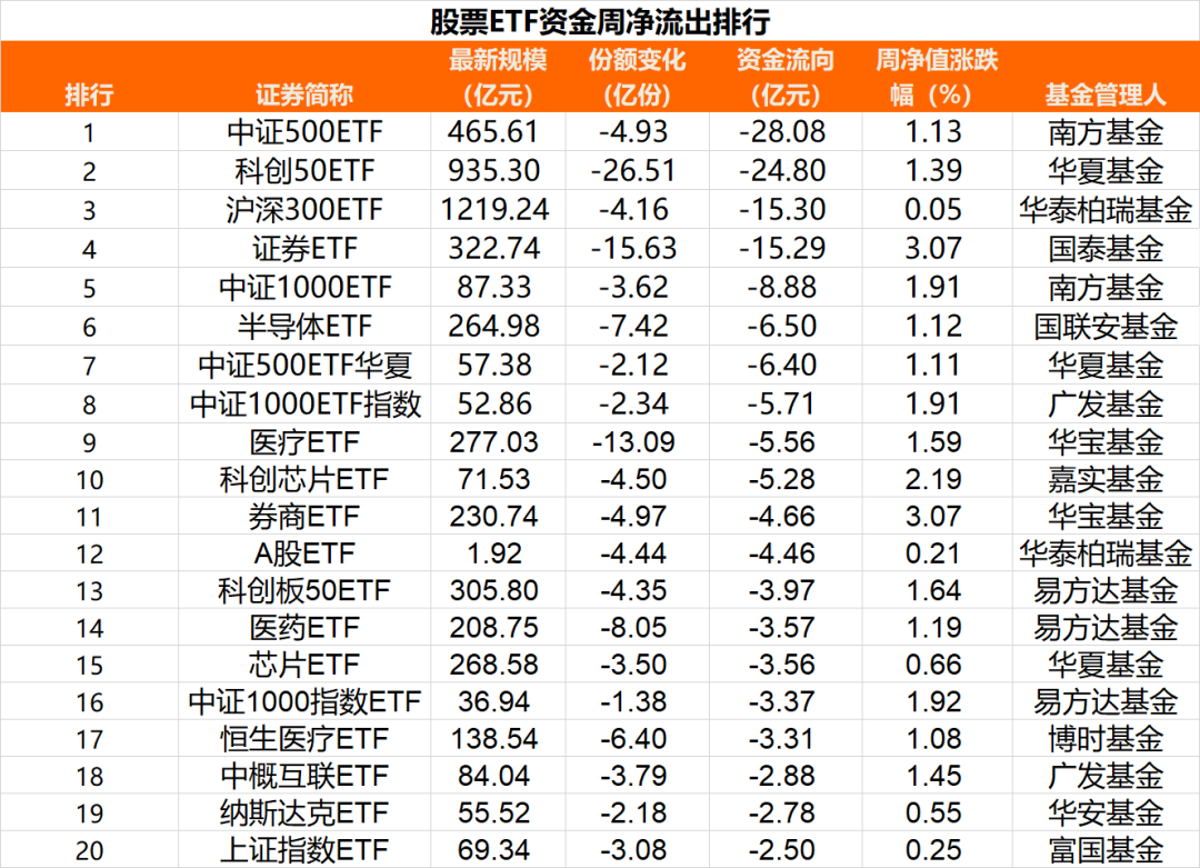 资金净流出前20大股票ETF中,中证500ETF、科创50ETF、券商ETF各占据2席,中证1000ETF、半导体芯片ETF、医疗ETF各占据3席。