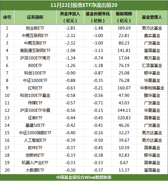 资金净流出方面,昨日创业板ETF、中概互联网ETF、中概互联ETF三只产品净流出超2亿元。同时,传媒、券商、人工智能、创新药等多只行业主题ETF产品“失血”超0.3亿元。