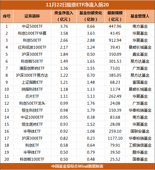 股票ETF市场资金流向方面,资金仍在持续抄底,昨日(11月22日)份额净增长11.04亿份,按照区间成交均价测算,净流入资金约为12.33亿元。至此,本周已连续三日呈现净流入态势。