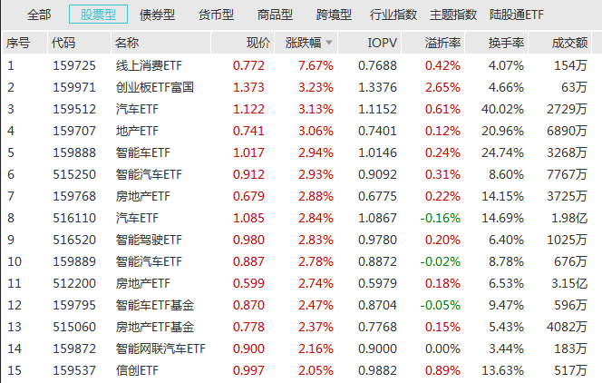 股票ETF二级市场上,今日线上消费ETF领涨,涨幅高达7.67%;创业板ETF富国、汽车ETF、地产ETF等多只产品涨幅超3%。