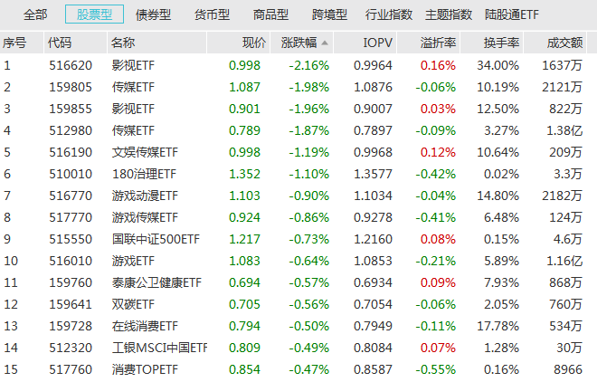受板块调整影响,影视、传媒等多只相关主题ETF跌幅居前。其中,影视ETF以2.16%的跌幅居于首位。