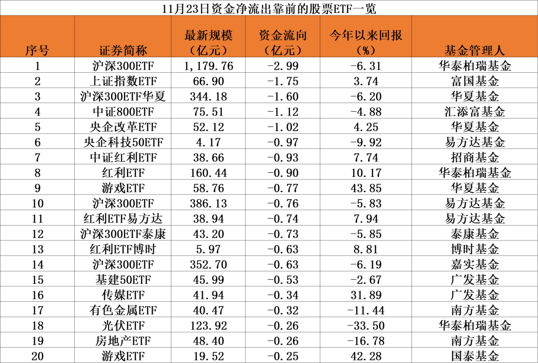 从资金净流出排行看,11月23日,资金净流出超1亿元的股票ETF中,沪深300ETF、上证指数ETF、中证800ETF占大头,此外,央企改革ETF、央企科技50ETF、中证红利ETF当日资金净流出居前。