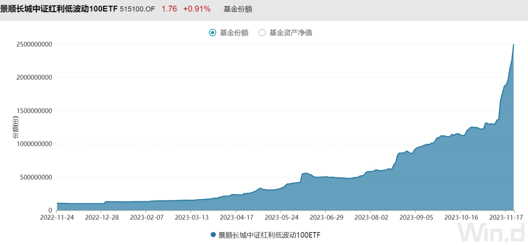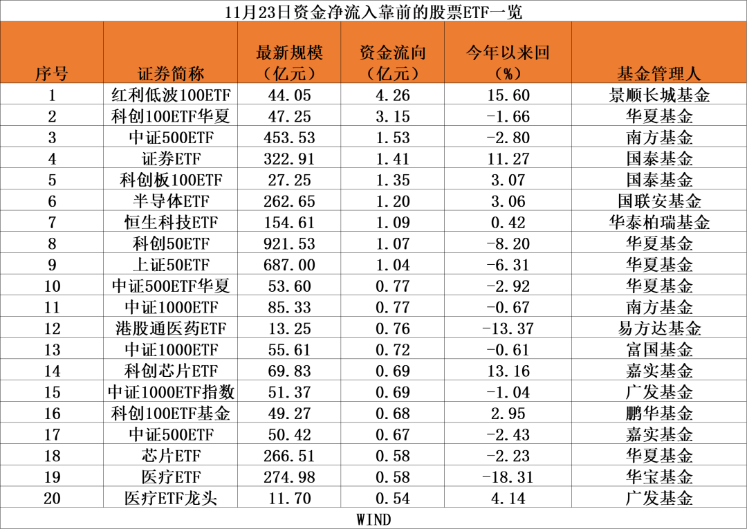 值得注意的是,景顺长城红利低波100ETF当日增加2.42亿份,至25亿份,再创历史新高,资金净流入达4.26亿元,位居当日资金净流入第一。记者发现,景顺长城红利低波100ETF自2020年成立以来回报达76.19%,截至11月23日,今年以来,该ETF基金份额激增1837.21%,规模则飙涨了2147.45%,至44.05亿元。