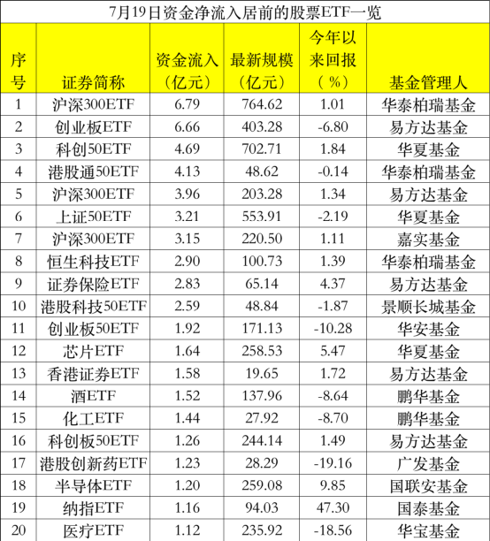 从资金净流入排行看,7月19日,多只沪深300ETF、创业板ETF、科创50ETF资金净流入居前,比如华泰柏瑞沪深300ETF、易方达创业板ETF单日“吸金”超6亿元,华夏科创50ETF、华泰柏瑞港股通50ETF单日“吸金”超4亿元。此外,多只芯片、证券保险、酒、化工ETF单日也资金净流入居前。