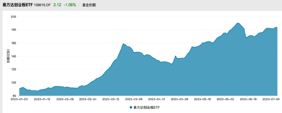 7月19日,易方达创业板ETF持续吸金,最新规模达403.28亿元。与年初的 206.02亿元相比,易方达创业板ETF年内增长近200亿元,增长率达到 95%,近乎翻倍增长。该ETF也是全市场15只跟踪创业板指ETF中规模最大的产品,目前创业板指ETF整体规模已达超570亿元。