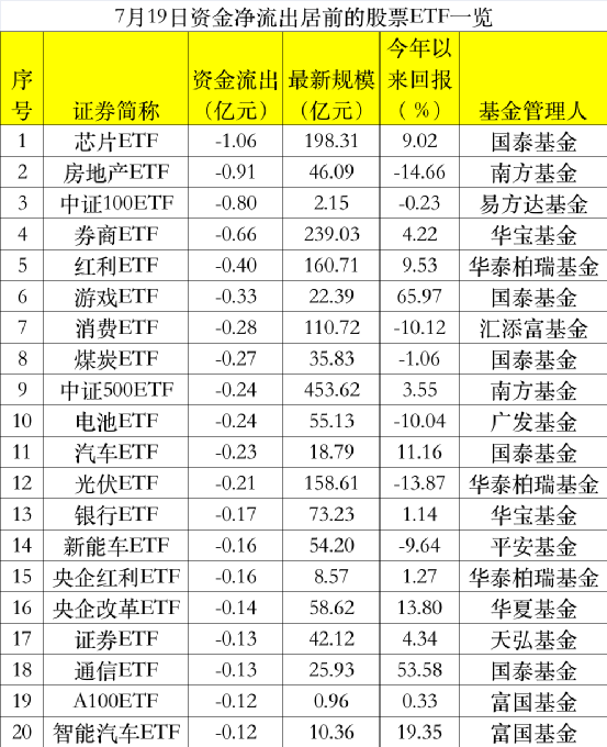 从资金净流出来看,7月19日,芯片、房地产、券商、红利、游戏、消费、煤炭、电池、汽车、光伏、银行、通信等热门细分赛道ETF资金净流出居前。比如,国泰芯片ETF资金净流出超1亿元,南方房地产ETF、华宝券商ETF资金净流出均超0.5亿元,此外,易方达中证100ETF、南方中证500ETF也资金净流出居前。