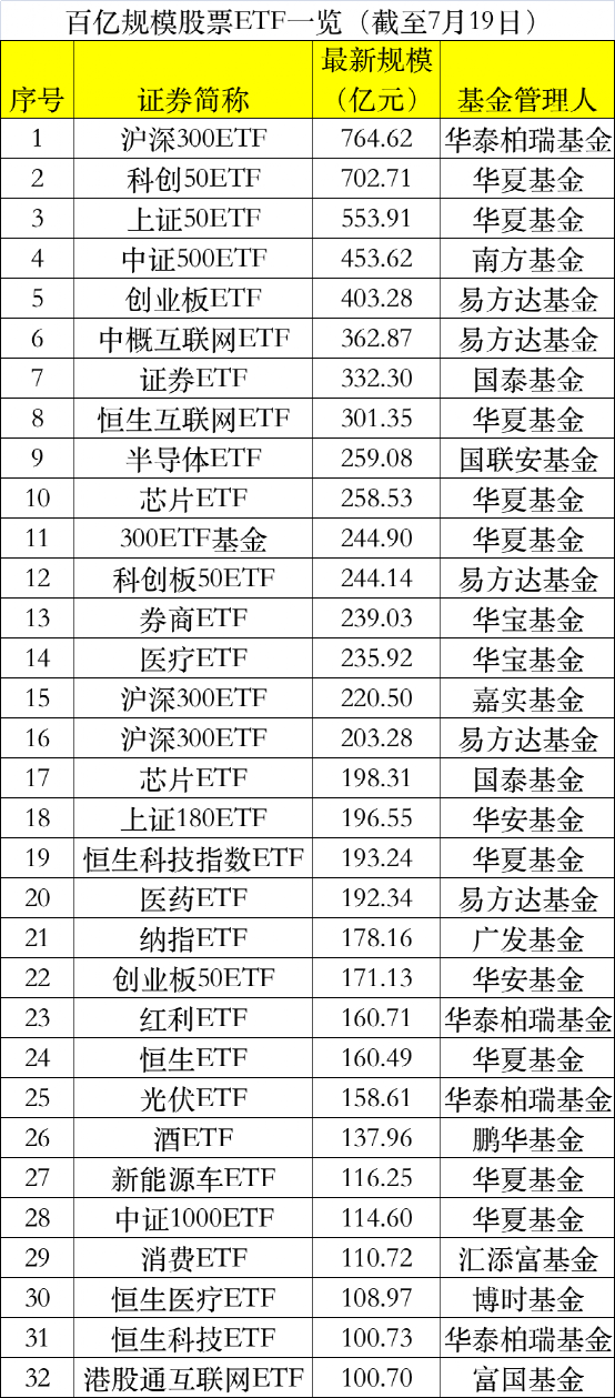 整体来看,在今年股票ETF市场继续扩容下,百亿股票ETF数量达32只。目前规模前四强的宽基指数中,华泰柏瑞沪深300ETF规模达764.62亿元,紧随其后的是华夏科创50ETF,规模达702.71亿元,华夏上证50ETF同期规模超500亿元,南方中证500ETF、易方达创业板ETF最新规模超400亿元。