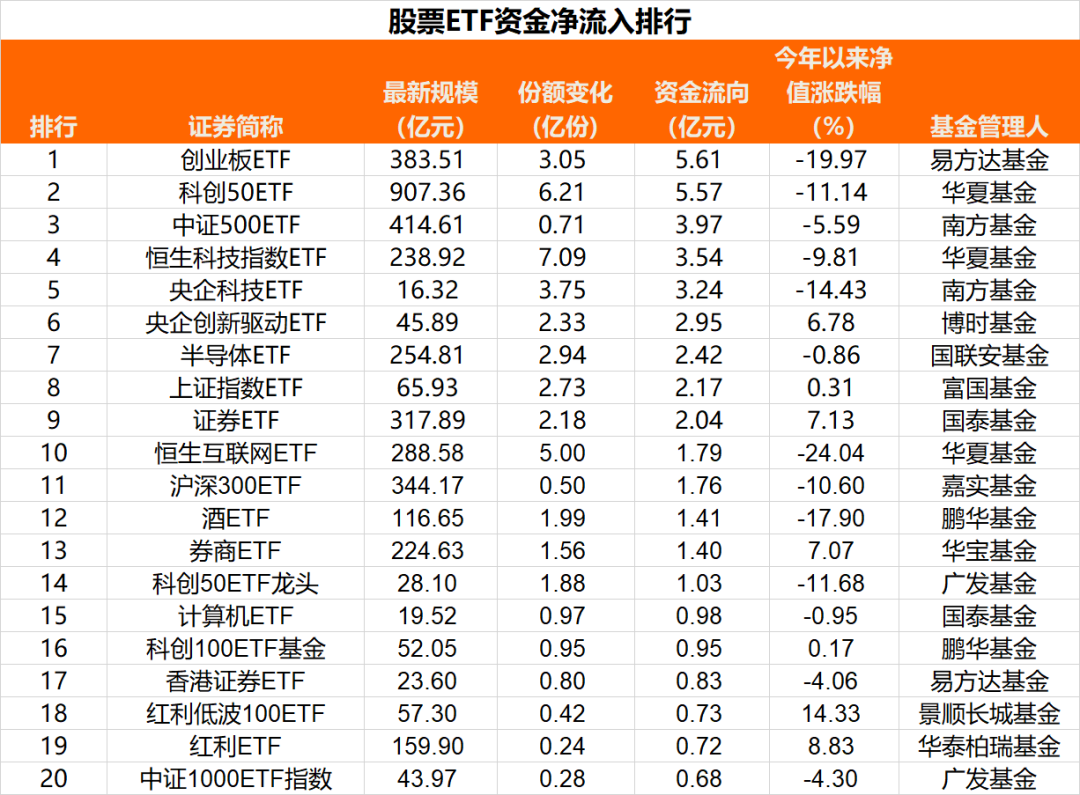 净流入方面,创业板ETF、科创50ETF、中证500ETF资金净流入居前;净流出方面,沪深300ETF、中证1000ETF、医药ETF成为“失血”主力。