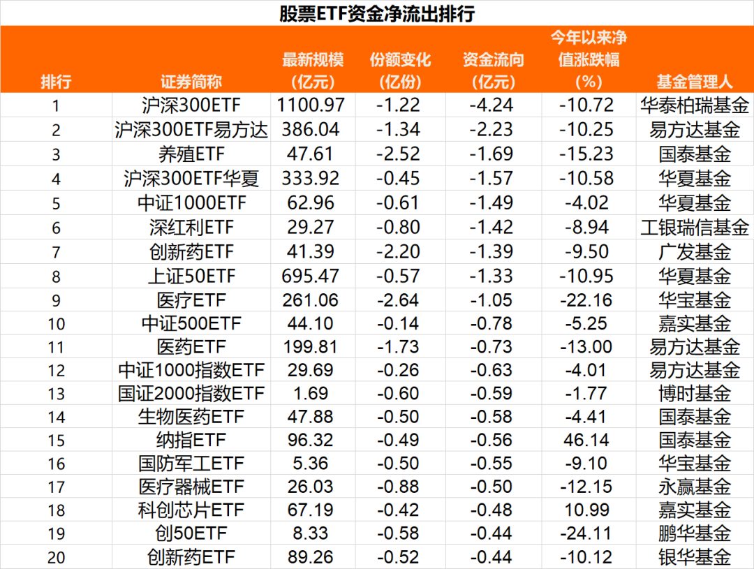 其中,华泰柏瑞沪深300ETF份额减少1.22亿份,资金净流出4.24亿元,易方达沪深300ETF资金净流出2.23亿元,国泰养殖ETF、华夏沪深300ETF分别净流出1.69亿元、1.57亿元。此外,华夏中证1000ETF、工银瑞信深红利ETF、广发创新药ETF、华夏上证50ETF及华宝医疗ETF等净流出资金也超过1亿元。