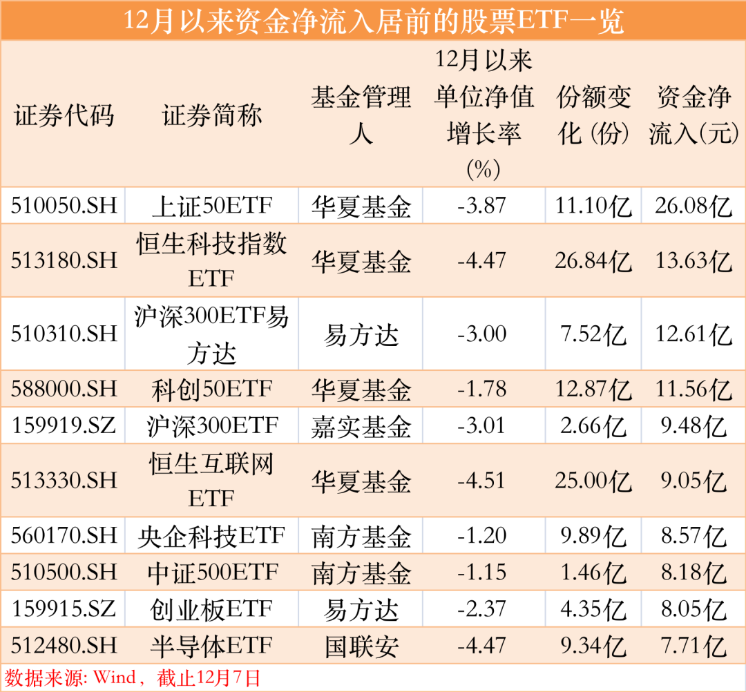 除了华夏上证50ETF之外,华夏恒生科技指数ETF、易方达沪深300ETF、华夏科创50ETF也均有10亿元以上的资金净流入。嘉实沪深300ETF、华夏恒生互联网ETF等也进入12月以来资金净流入ETF前十。