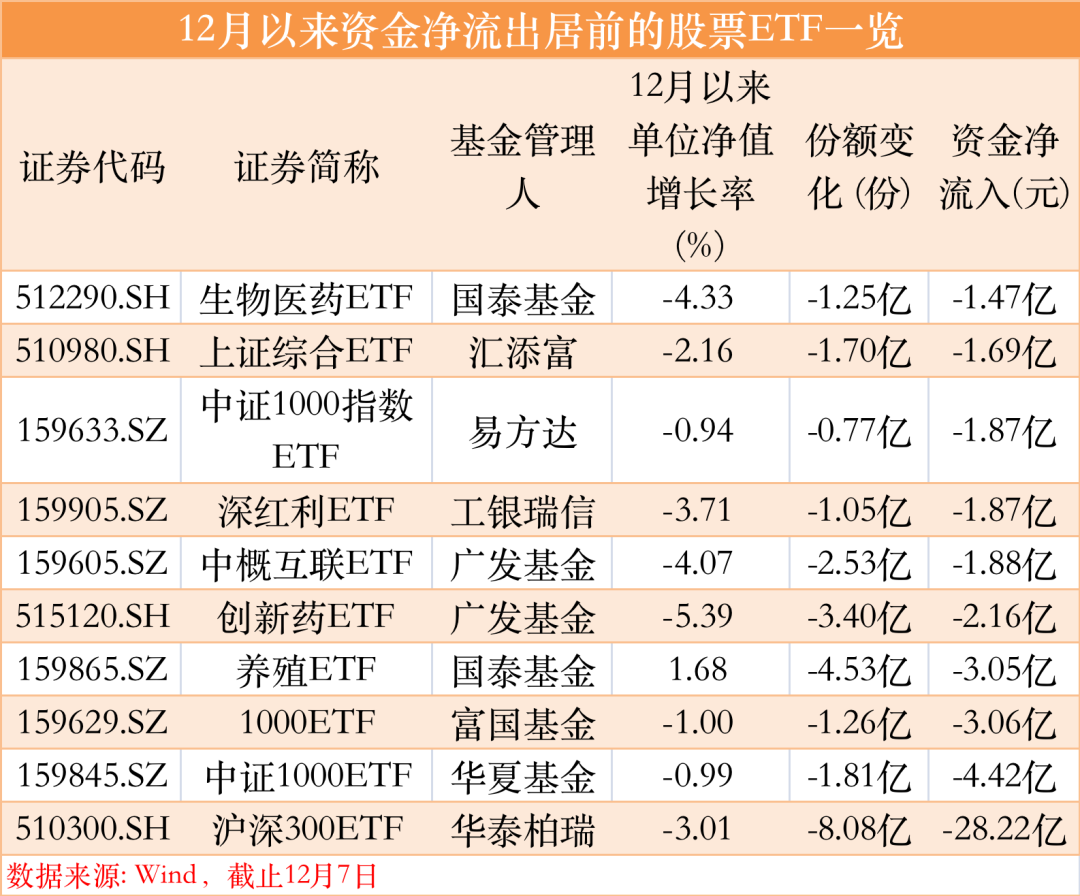 与之形成对比的是,12月以来,包括华夏、富国、易方达旗下的中证1000ETF资金净流出居前。
