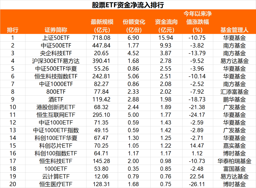 从资金净买入排行榜看,周一当天,16只股票ETF资金净流入1亿元以上,其中11只为宽基ETF,5只为行业主题ETF。上证50ETF、中证500ETF及央企科技ETF净流入领先。