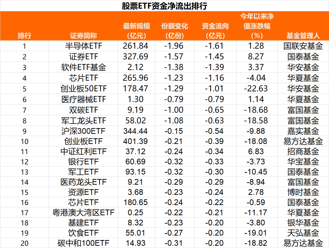 其中,国联安半导体ETF份额减少1.96亿份,资金净流出1.61亿元,成为当日资金净流出最多的股票ETF;国泰证券ETF资金净流出1.45亿元,居于第二。华安软件ETF、华夏芯片ETF分别资金净流出1.39亿元、1.16亿元。此外,华夏医疗器械ETF、富国双碳ETF、富国军工龙头ETF等净流出资金也超过0.5亿元。