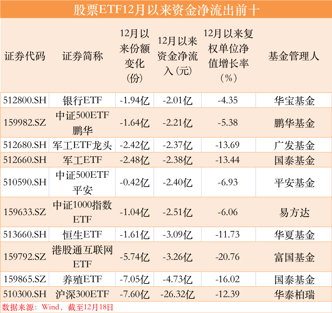资金净流出方面,华泰柏瑞沪深300ETF12月以来资金净流出超过26亿元,国泰养殖ETF资金12月以来净流出4.73亿元,富国港股通互联网ETF、华夏恒生ETF资金净流出均超过3亿元,部分中证1000ETF及军工ETF资金净流出也较为居前。