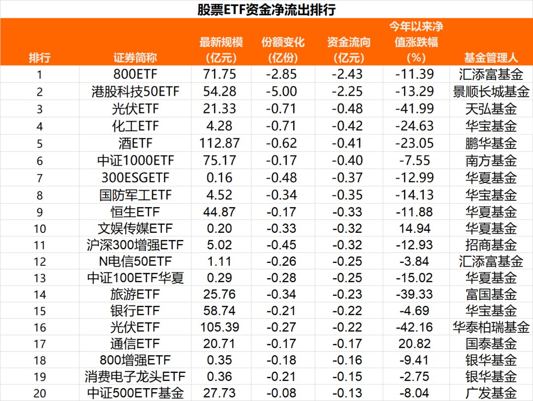 其中,汇添富中证800ETF份额减少2.85亿份,资金净流出2.43亿元,成为当日资金净流出最多的股票ETF;景顺长城港股科技50ETF资金净流出2.25亿元,居于第二。
