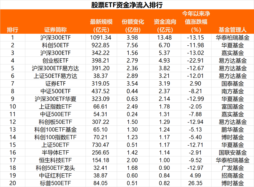 此外,易方达创业板ETF、易方达沪深300ETF、易方达上证50ETF净流入均超3亿元,华夏沪深300ETF、富国上证指数ETF、嘉实中证500ETF、易方达科创50ETF、鹏华及博时旗下科创100ETF、华夏上证50ETF、华泰柏瑞恒生科技ETF净流入均在1亿元以上。