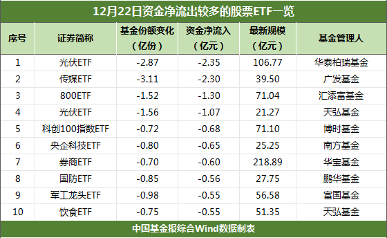 从净流出情况来看,行业主题ETF产品中,当日光伏、传媒、券商等主题ETF产品净流出较多,其中光伏ETF、传媒ETF净流出均超2亿元。