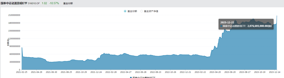 12月22日,相关部门发布征求意见稿,拟限制网络游戏过度使用和高额消费等,引发广泛关注,游戏、传媒个股相继跳水,游戏传媒主题ETF也集体走低,并有多只产品跌停。不过,从资金流入情况来看,当日超半数ETF产品实现了资金净流入。其中,游戏ETF份额增加了3.14亿份,最新份额也突破20亿份,创下历史新高;当日也凭借3.33亿元的净流入跻身净流入榜单前十。