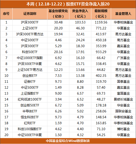 资金净流入方面,本周沪深300ETF以103.53亿元的净流入排在首位,该产品本周份额净增加30.48亿份,最新份额突破340亿份,创下历史新高。上证50ETF、沪深300ETF易方达则分别以46.3亿元、32.41亿元的净流入排在第二、三位。此外,中证500ETF、科创50ETF等多只产品本周资金净流入均超10亿元。