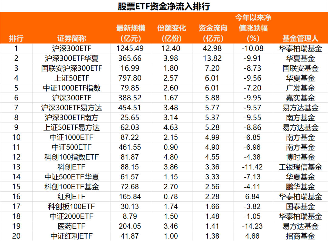 行业主题方面,华泰柏瑞红利ETF、易方达医药ETF、招商中证红利ETF、嘉实科创芯片ETF、华泰柏瑞东南亚科技ETF、华泰柏瑞光伏ETF均出现1亿元以上净流入。