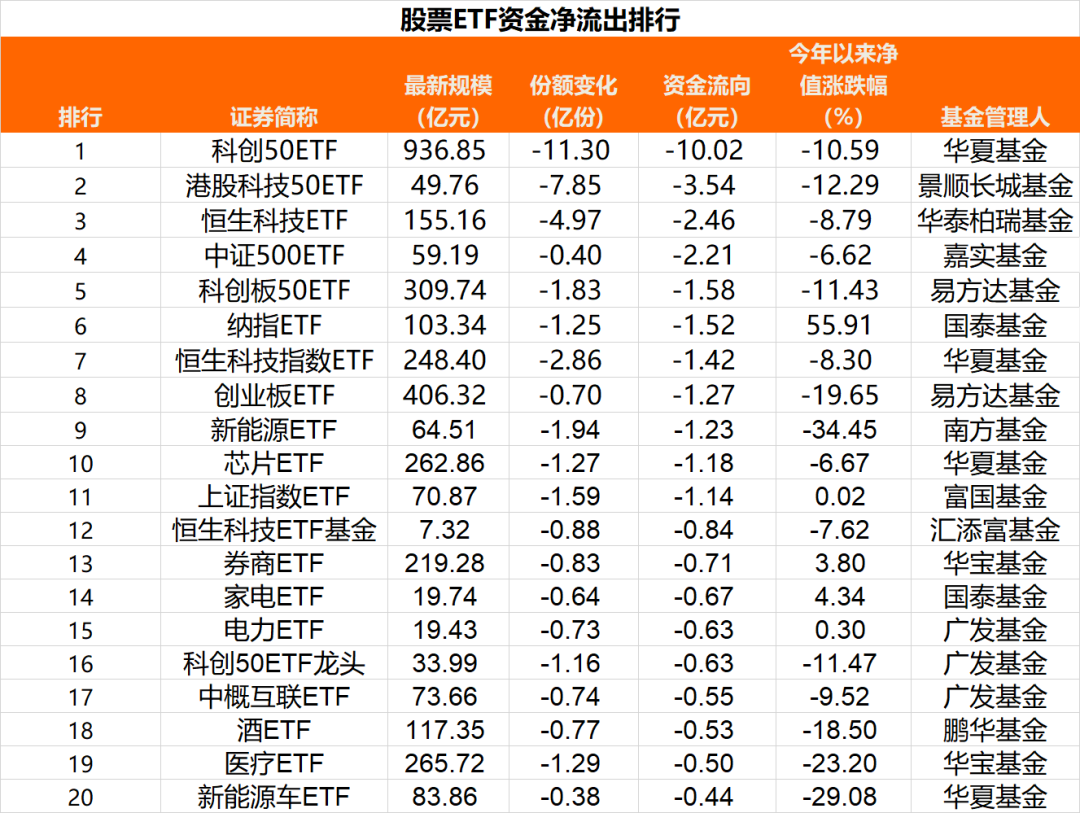 其中,华夏科创50ETF份额减少11.30亿份,资金净流出10.02亿元,成为当日资金净流出最多的股票ETF;景顺长城港股科技50ETF资金净流出3.54亿元,居于第二。华泰柏瑞恒生科技ETF、嘉实中证500ETF、易方达科创50ETF、国泰纳指ETF、华夏恒生科技指数ETF等净流出均超1亿元。