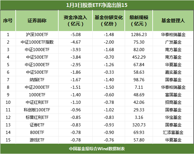 净流出方面,1月3日共有10只产品净流出超1亿元,且宽基ETF“失血”居前。
