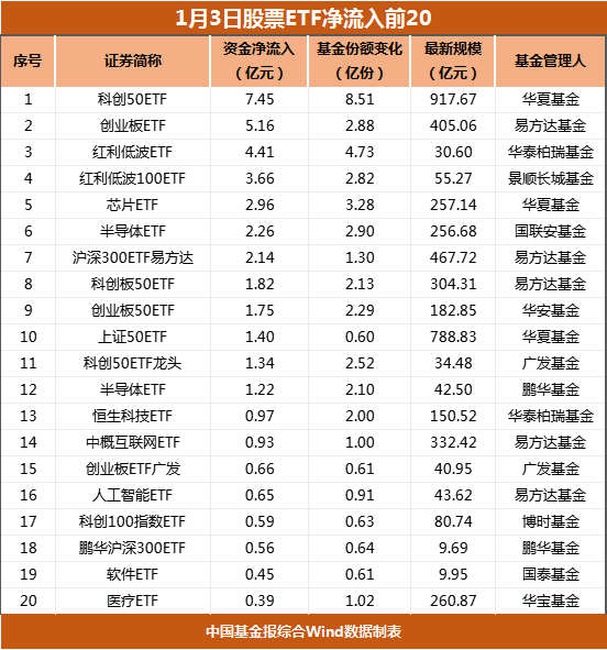 从资金净流入排行看,1月3日共有12只产品净流入超1亿元。其中,科创50ETF以7.45亿元的净流入排在首位,当日基金份额增加了8.5亿份,最新规模约为918亿元。