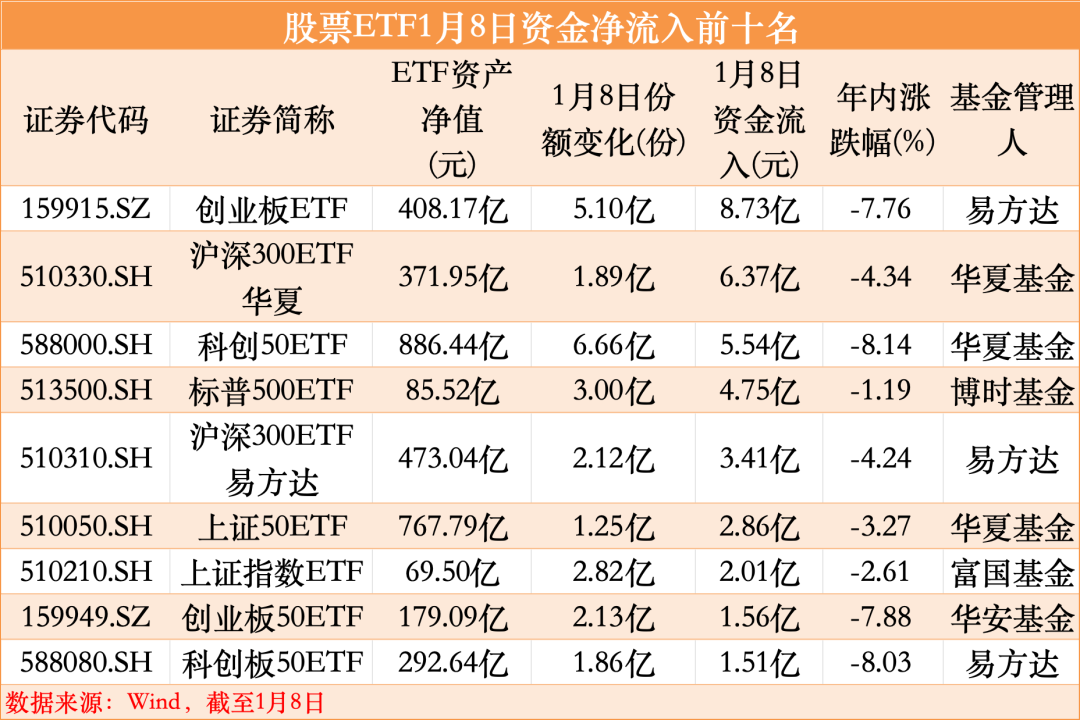 Wind数据显示,1月8日股市调整过程中,全市场股票ETF总份额增加超40亿份,资金净流入35.68亿元,易方达创业板ETF、华夏沪深300ETF等重要宽基ETF净流入居前。
