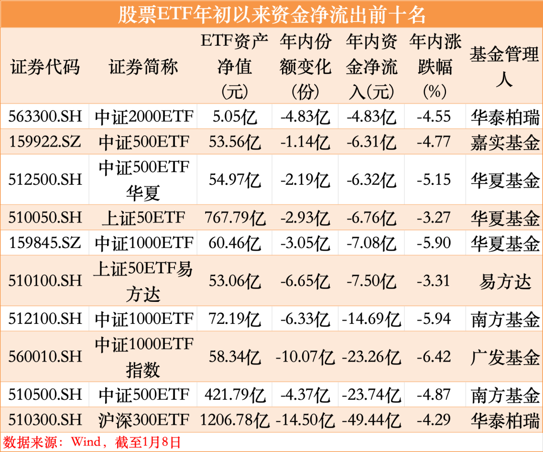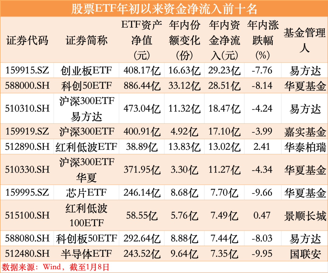 Wind数据显示,截至1月8日,易方达创业板ETF、华夏科创50ETF年内分别“吸金”29.23亿元、28.51亿元,位居全市场股票ETF资金净流入第一、第二名。其他宽基ETF中,易方达、嘉实、华夏旗下沪深300ETF也均有10亿元级别的资金净流入。