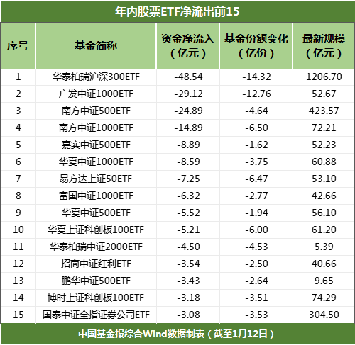 净流出方面,年内共有4只产品净流出超10亿元,其中华泰柏瑞沪深300ETF净流出最多,达48.54亿元,广发中证1000ETF、南方中证500ETF净流出均超20亿元,分别排在第二、三位。