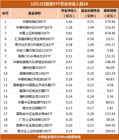 具体来看1月12日的资金净流入情况,当日有2只产品净流入超1亿元。其中,华泰柏瑞红利ETF以1.66亿元的净流入排在首位,华泰柏瑞中证光伏产业ETF以1.28亿元的净流入排在第二位。华夏上证科创板50ETF则以0.81亿元排在第三位。