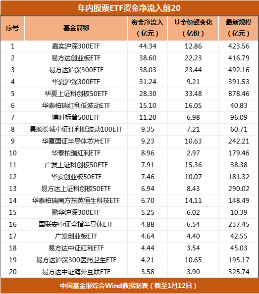 拉长时间看,尽管年初股票ETF市场曾出现短暂的净流出,但整体看资金仍保持净流入态势。截至1月12日,年内基金份额净增长171亿份,按区间成交均价测算,资金净流入达109.6亿元。