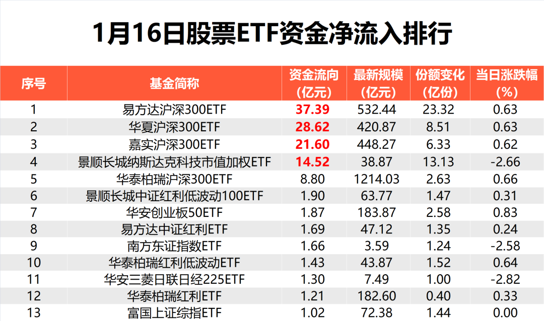 头部基金公司旗下ETF在1月16日获得巨量净流入。数据显示,当日易方达旗下ETF合计资金净流入达36亿元。其中,“大块头”易方达沪深300ETF昨日净流入超37亿元,该ETF场内规模升至532亿元,加场外规模更是达到545亿元。此外,易方达中证红利ETF当日净流入1.7亿元。
