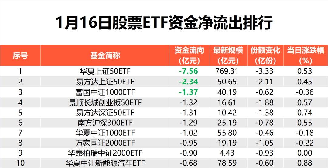 其中,华夏、易方达旗下上证50ETF净流出近10亿元,富国、华夏旗下中证1000ETF也都有1亿元的净流出。