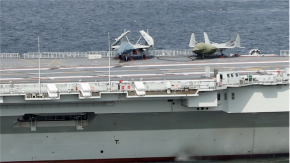 从传出的相关照片中可以看到,其飞行甲板上的标线,已经发生变化,此外,还有一架神秘战机的等比例模型。