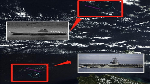(图解:商业卫星照片中,中国山东舰航母编队与美国里根号航母编队同框)